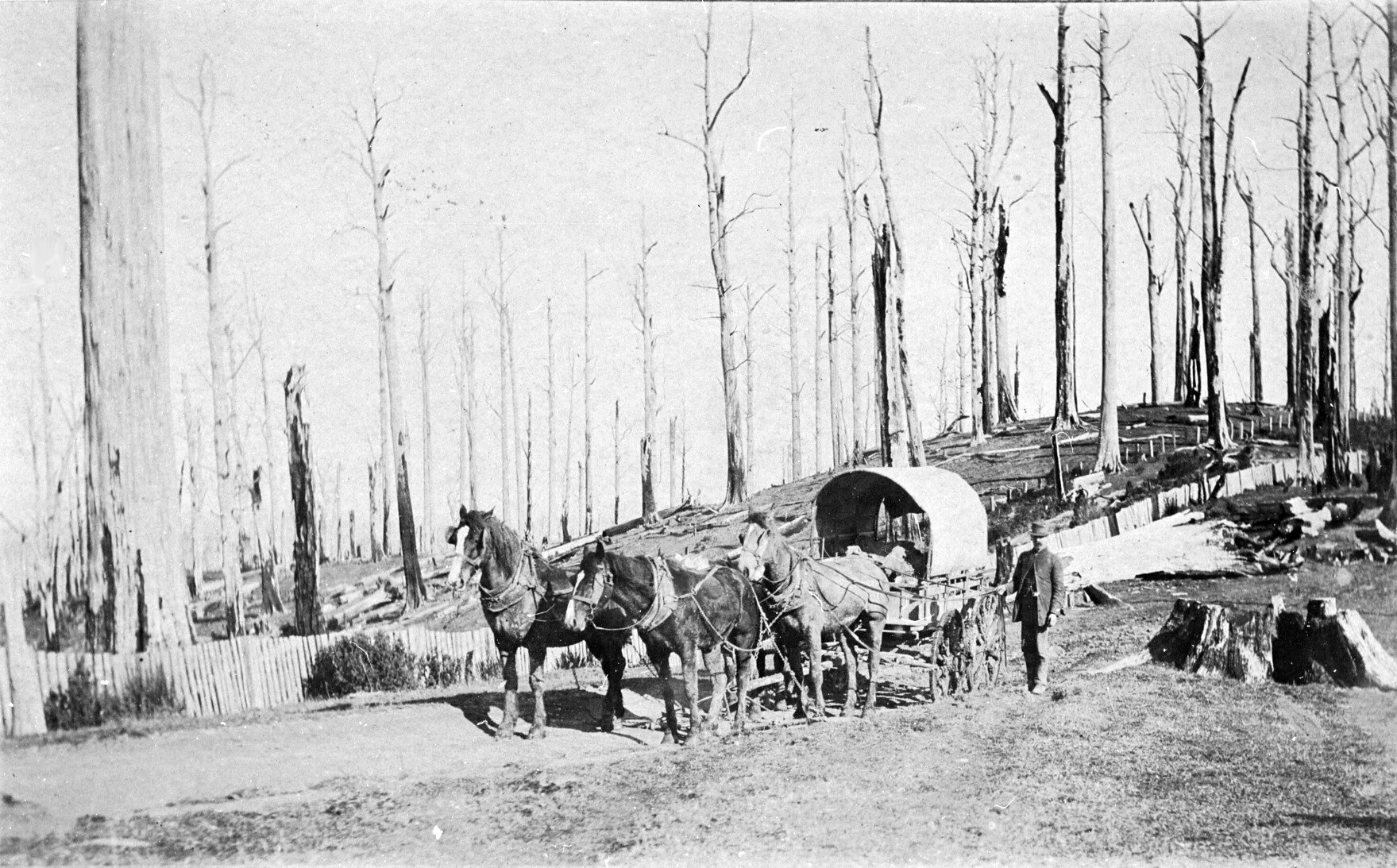 A horse-drawn covered wagon on a road in a burnt out area of bushland.