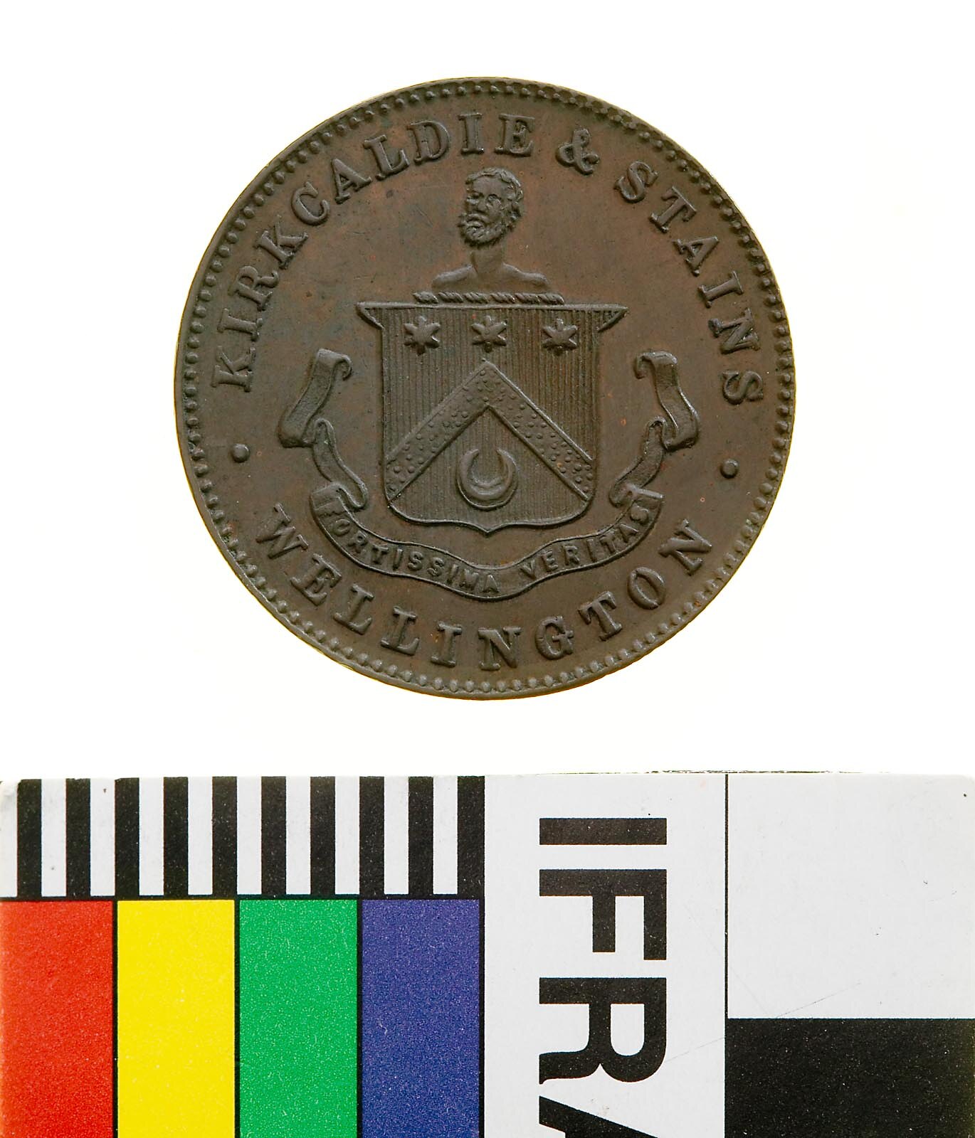 A round bronze token (26 mm diameter). The piece features the name, address and business of the issuer: Kirkcaldie & Stains, general drapers and outfitters, Wellington. The reverse features a coat of arms with a bearded bust as crest (John Kirkcaldie?).