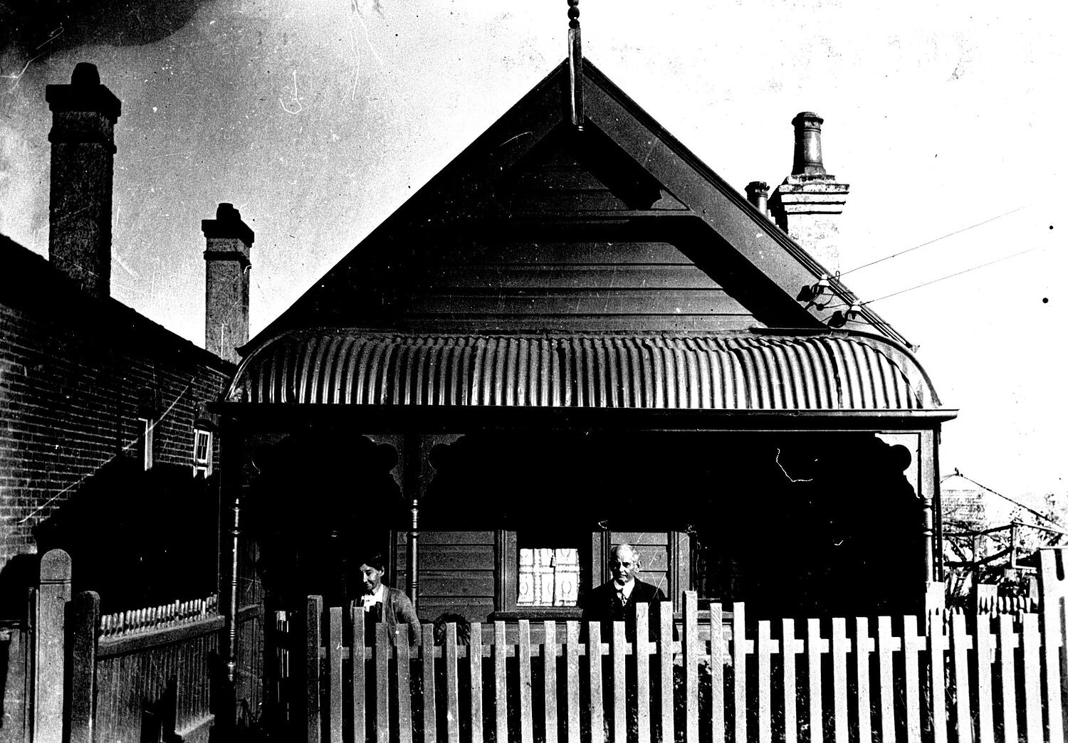 A man and woman in front of a small wooden house. The verandah has a corrugated iron roof.