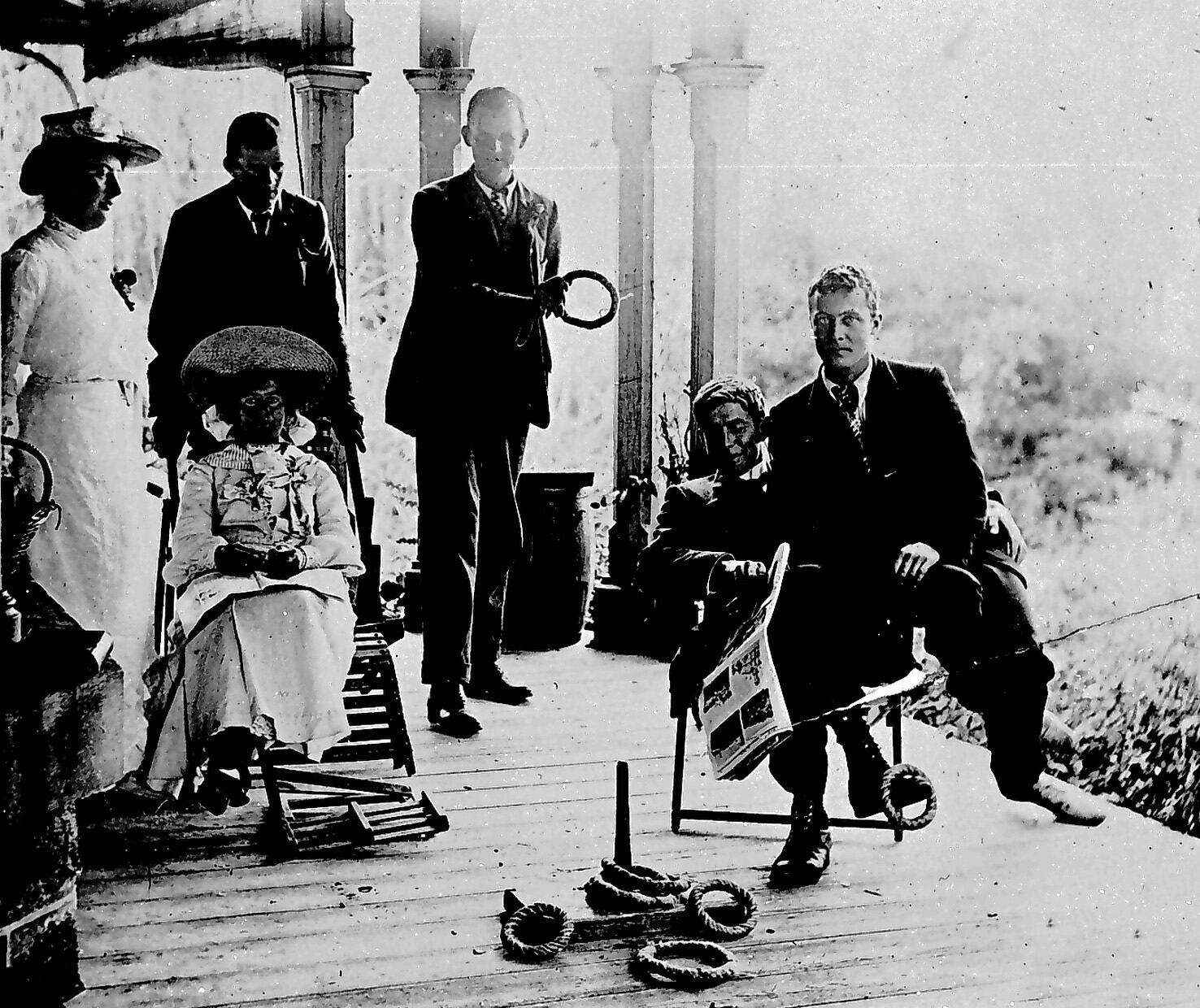 People on the verandah at 'Ensay' station. The men are engaged in a game of quoits.