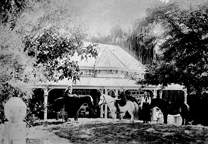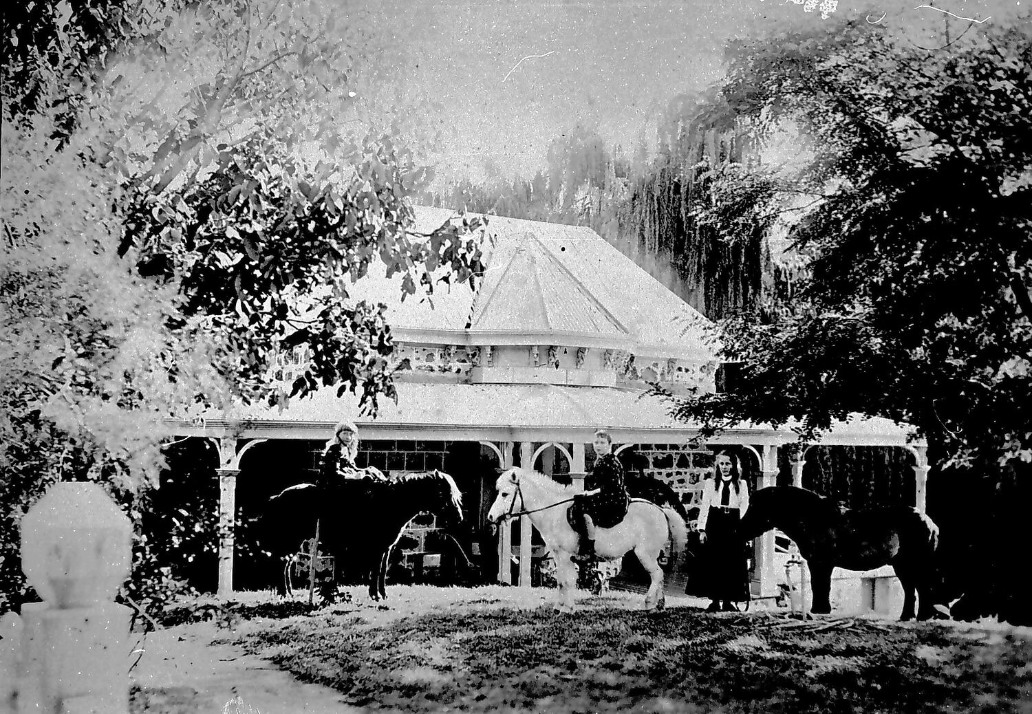 Three young girls with three ponies in front of a stone house with a large verandah. At left two of the girls are sitting on two of the ponies and at right one girl is standing next to another pony. Two ponies are dark coloured and one is white. The girl standing at right wears a skirt, shirt and tie and her hair is loose. Large trees are on either side of the house, and a fence or gate post is at front left.