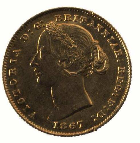 A gold coin (21.5 mm diameter with milled edge) featuring a head of Queen Victoria facing left and wearing a wreath of banksia with the date 1867 below. The reverse features the word AUSTRALIA below a royal crown within a wreath of laurel and with the words SYDNEY MINT above and ONE SOVEREIGN below.