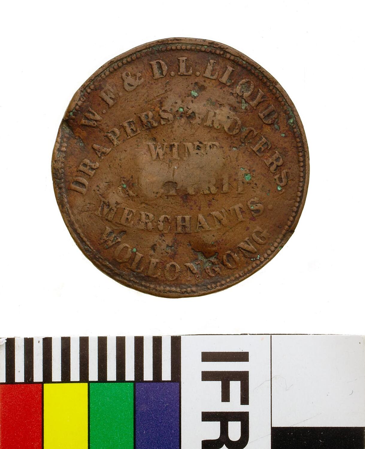 Obverse: W.F. & D.L. LLOYD DRAPERS GROCERS WINE & SPIRIT MERCHANTS WOLLONGONG Reverse: ADVANCE AUSTRALIA COLONIAL PRODUCE TAKEN IN EXCHANGE (1859)