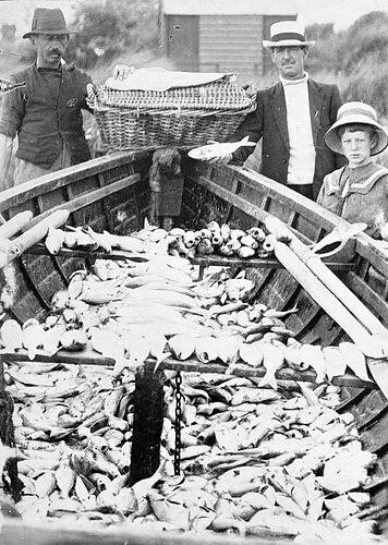 A fisherman with a boat load of fish. Another man and a young boy stand by the boat.