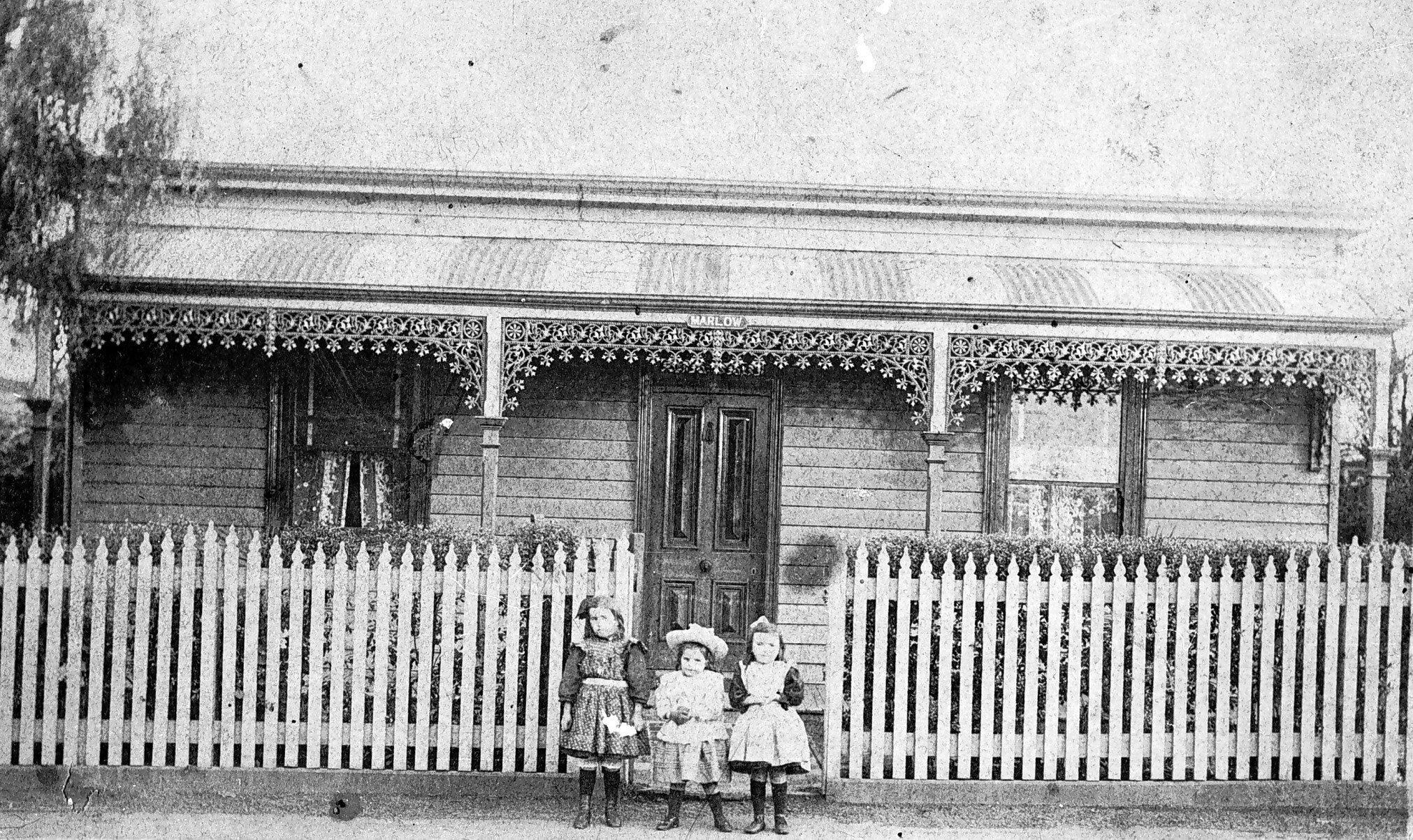 Three small children in front of their family home. The house was known as 'Marlow House'.