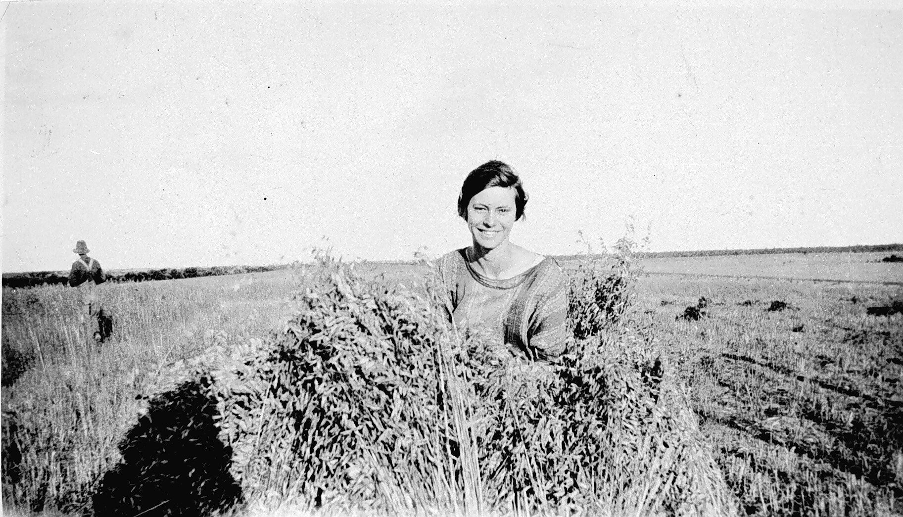 A young woman (Melinda Murfin) behind an oat stook.