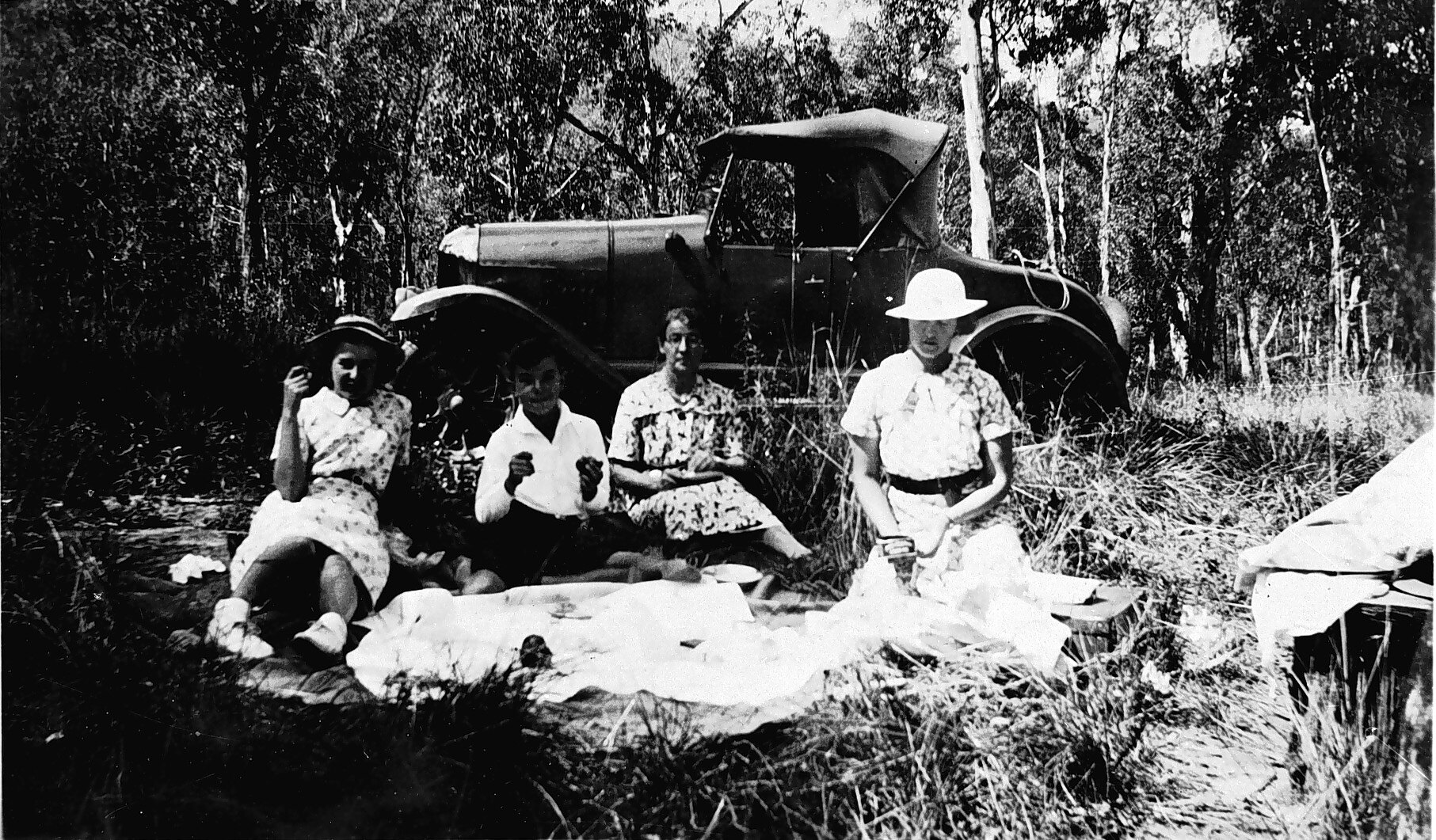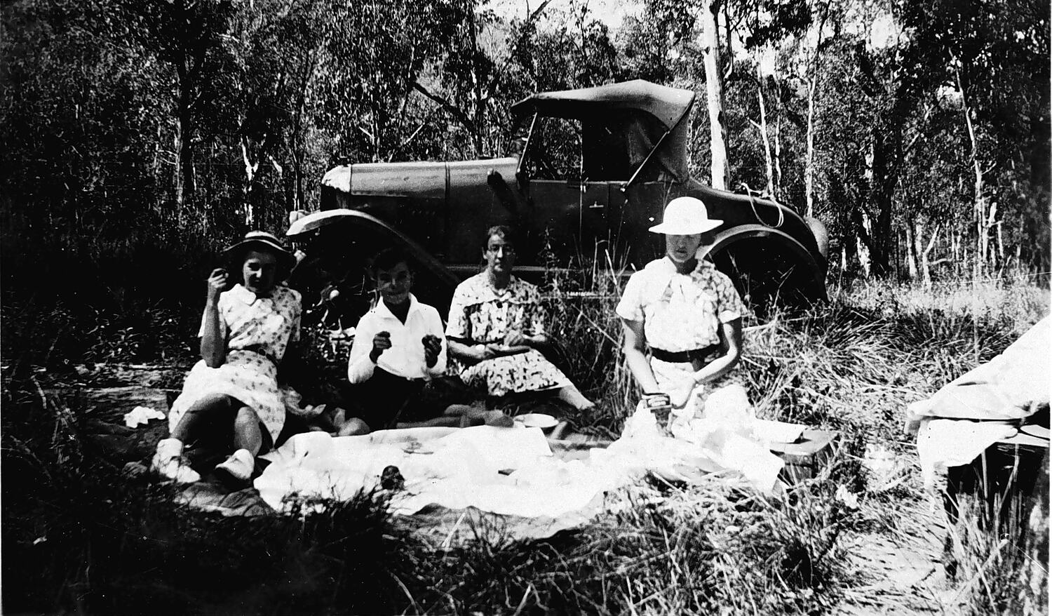 Three women and a boy at a picnic in the bush. A bull nose Morris car, 1923 Model is in the background.