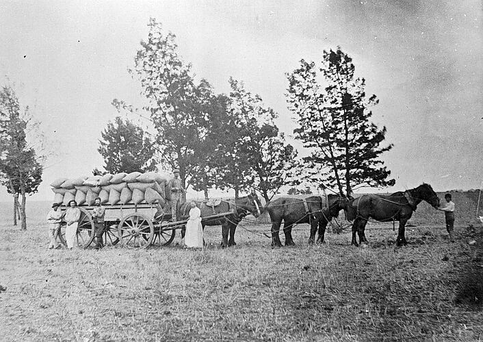 Agricultural Workers, Cereal Crops, Drays & Wagons, Farms, Horses, Sacks, Farmers, Women Farmers, Women in Agriculture, Women on Farms, Women's Work, Rural Life, Rural Women