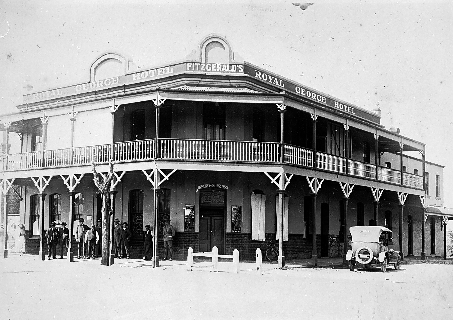 A group in front of Fitzgerald 's Royal George Hotel. There is a car parked on the right.