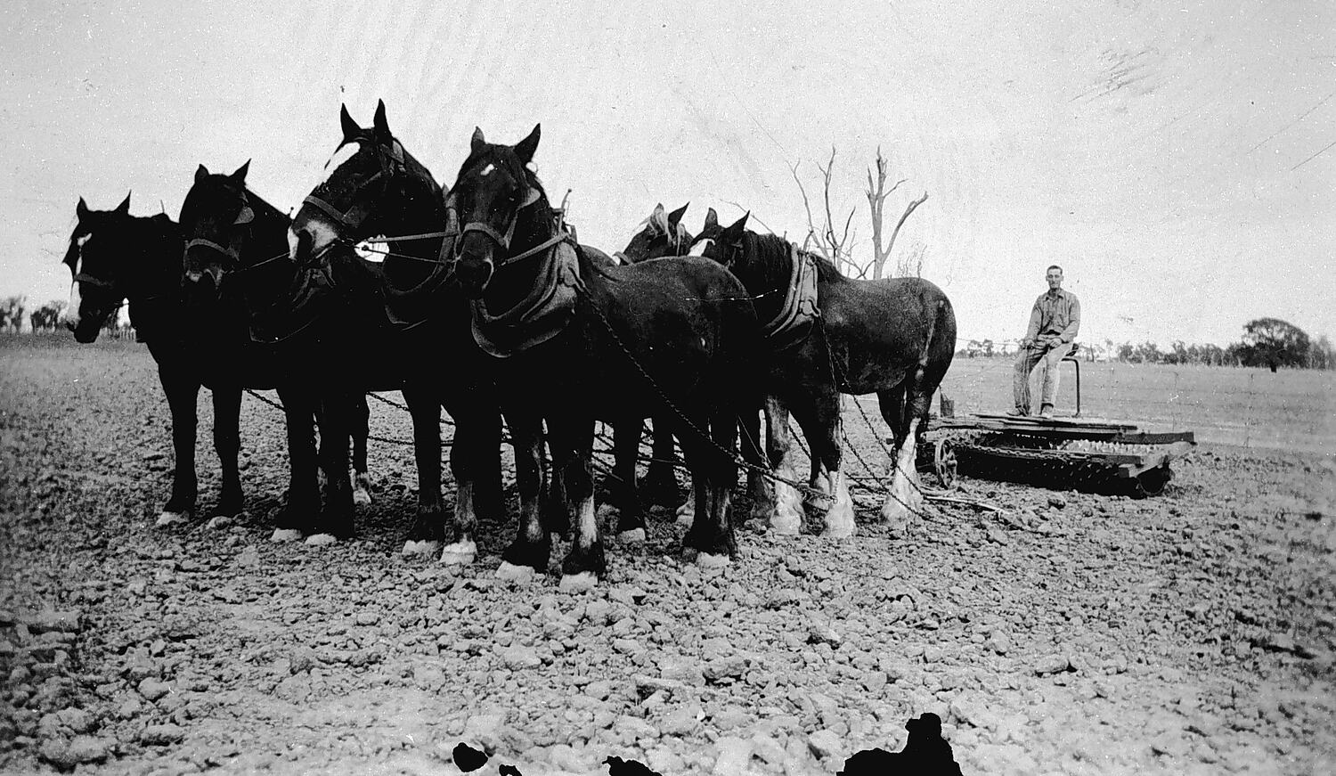 A farmer preparing the ground with a horse-drawn spike roller.