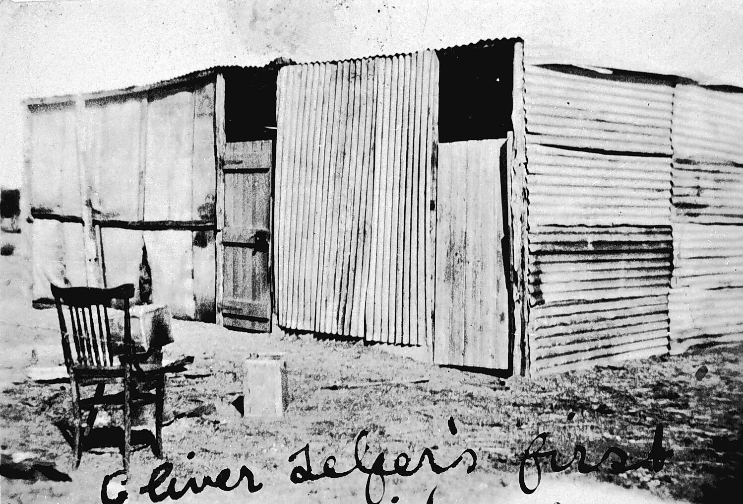 A soldier settler's first house. It is constructed of corrugated iron and hessian.