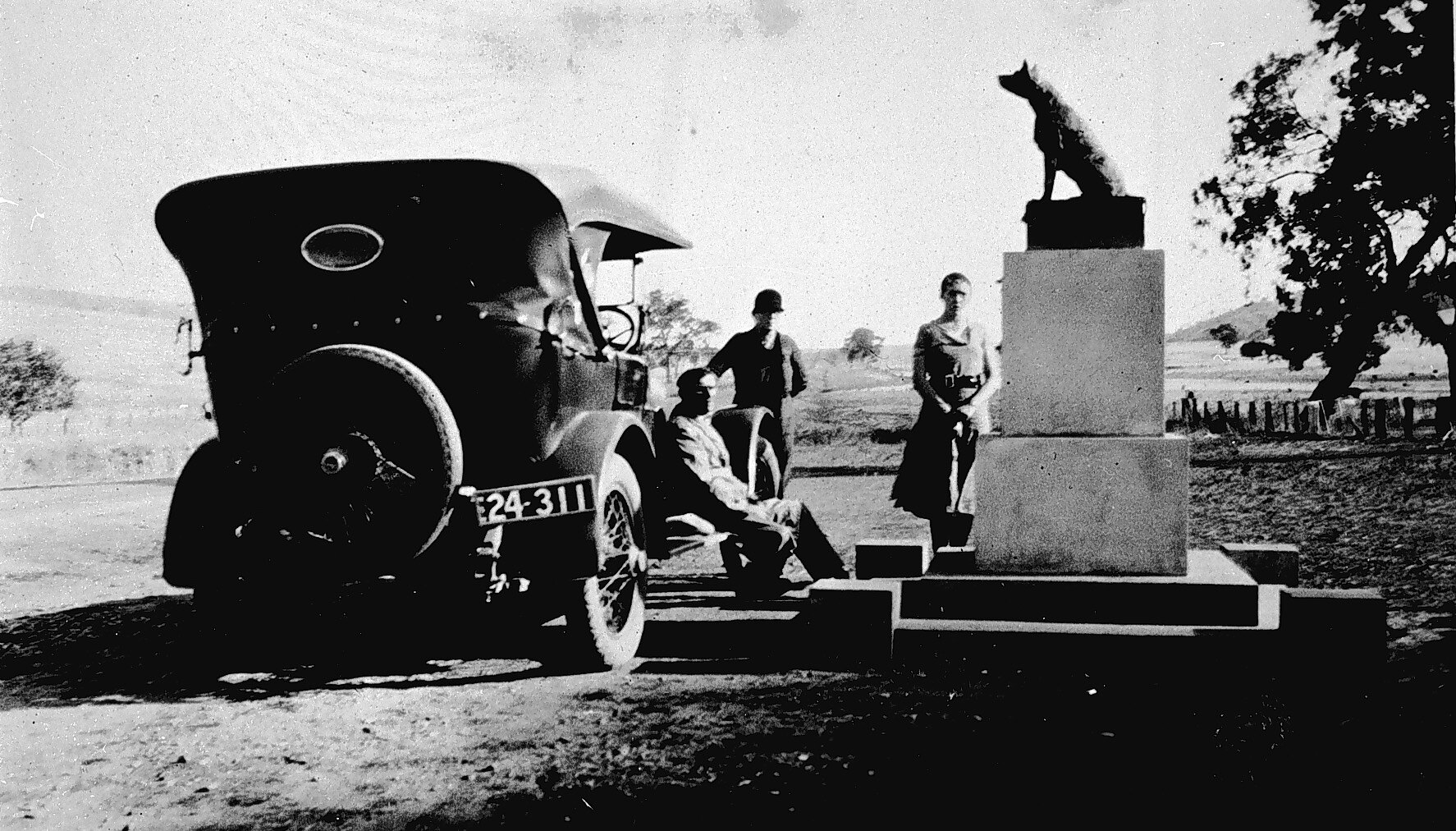 Two men and a woman beside the dog on the tucker box near Gundagai, NSW. One man is seated on the running board of a car.