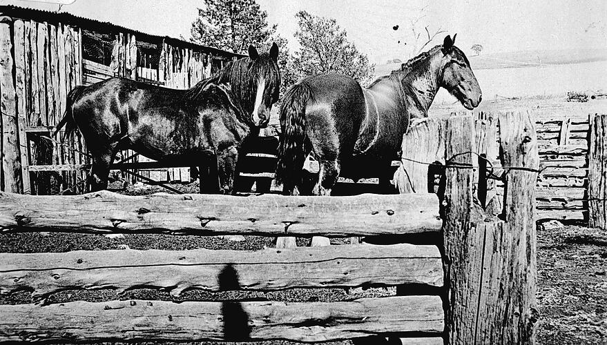 Two draught horses inside a railed yard, farm buildings in background.