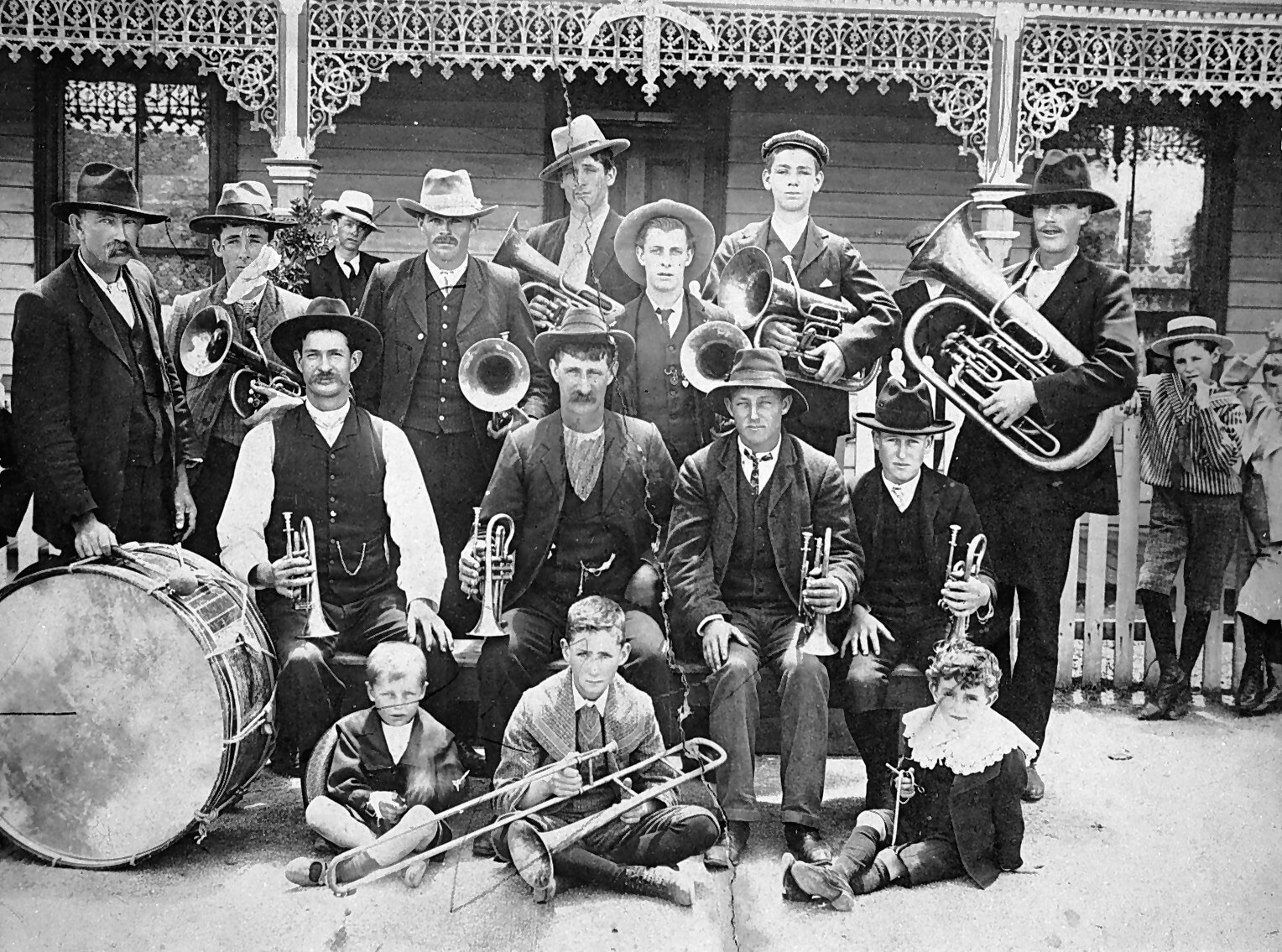 Brass Bands, Drums, Houses, Iron Lacework, Musical Instruments, Musicians, Trumpets, Verandahs
