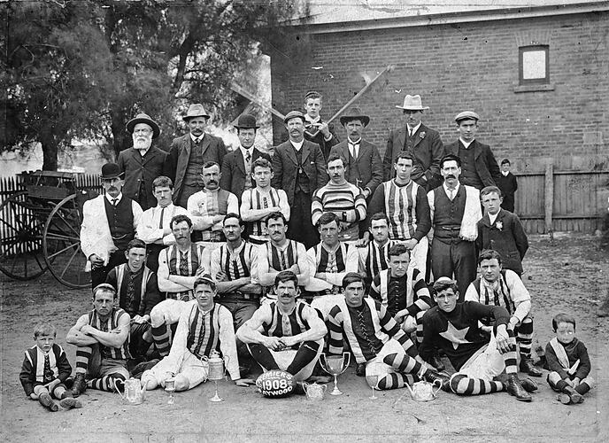 The Raywood Football Team, premiers in 1908, with their trophies.