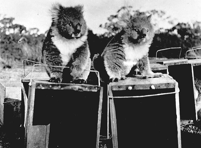 Two koalas sitting on boxes used to transport koalas from French Island.