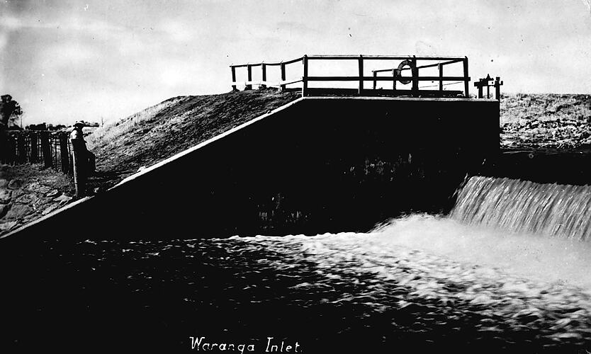 Printed in white across bottom of photograph; Waranga Inlet