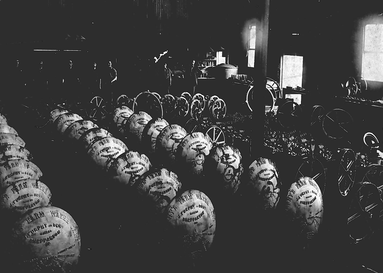 Inside Furphy 's Foundry. Objects displayed appear to be the cast ends of farm water carts. There are a number of wheels in the background.