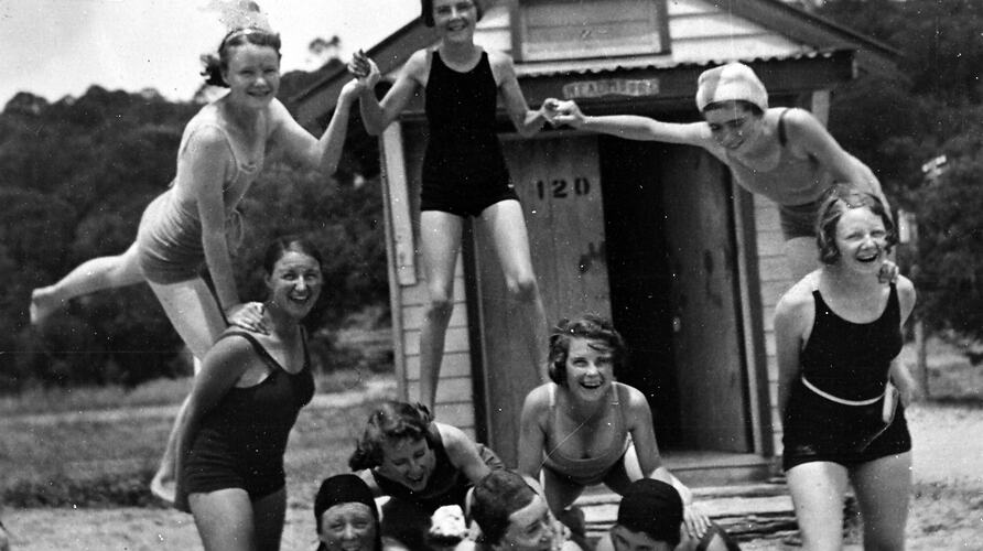 A group of young girls in bathing costume forming a pyramid outside a bathing box.
