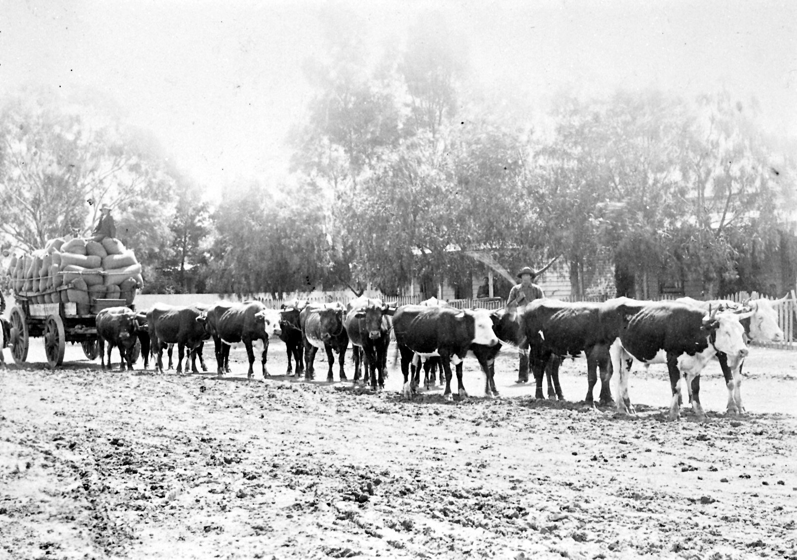 A bullock team pulling a wagon load of wool bales.