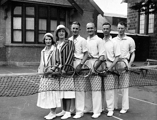 Four men and two women of the Noble Street Church Tennis Club standing by the net. The woman on the far left is Vera Jean Garrett.