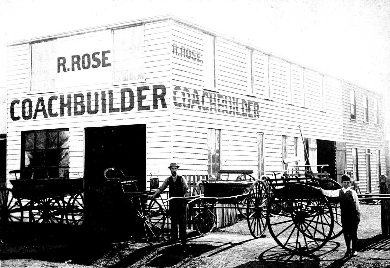 Two men and a number of buggies and wagons in front of the factory of R. Rose, Coachbuilder.