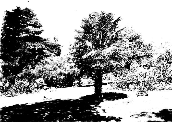 A gardener mowing the lawns in the Daylesford Botanical Gardens.