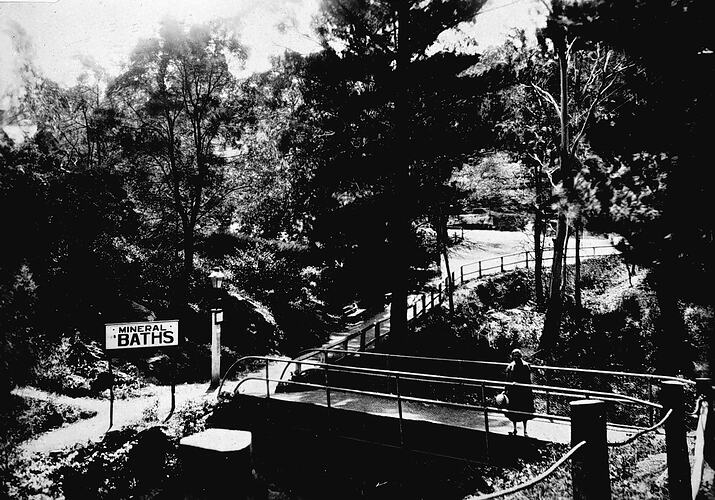 The mineral springs. There is a woman on a walkway and a sign reading 'Mineral Baths'.