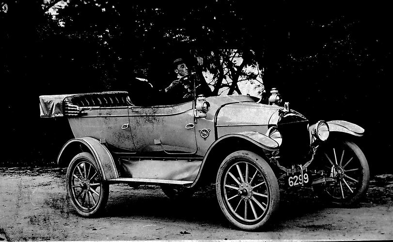 Two men in a model T Ford car.