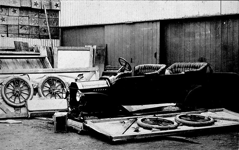 Cars were imported in packing crates and then assembled by dealers. This is a model T Ford in the yard of Harrison 's Garage.