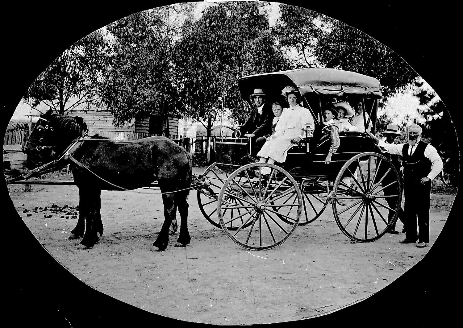 Members of the Baum family seated in a covered buggy on their way to a wedding. Outbuildings in the background.