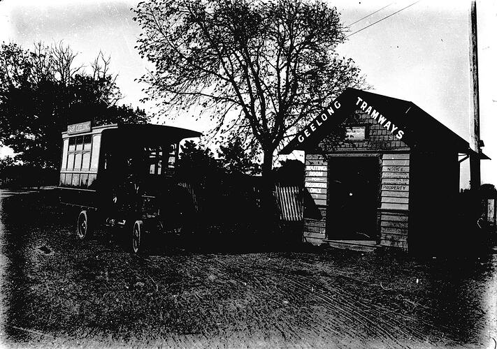A bus at a tramway shelter. The shelter carries the sign 'Geelong Tramways'.