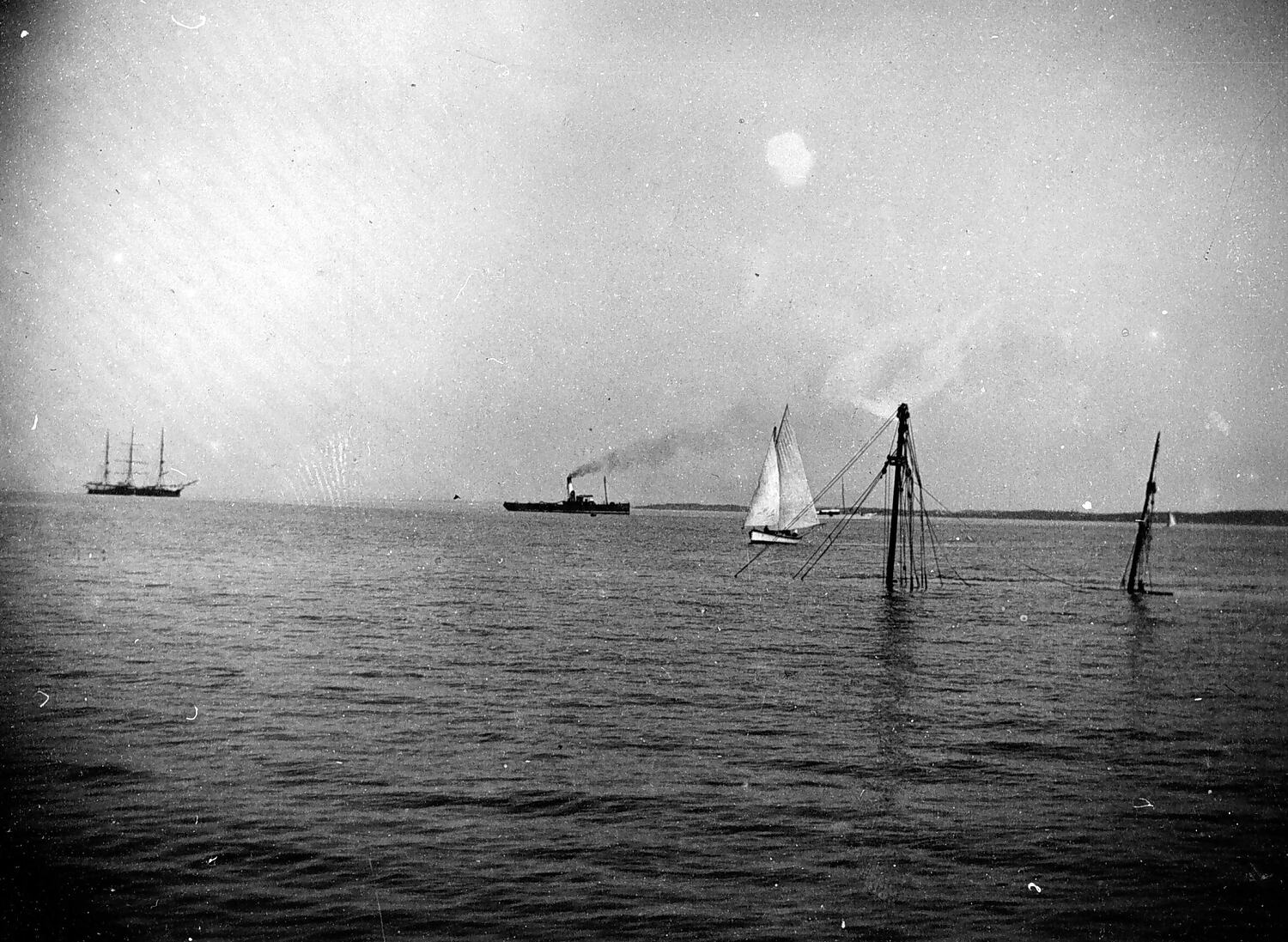 Masts of a sunken boat near the Queenscliff pier. There is a sailing ship, a steamer and a yacht in the background.