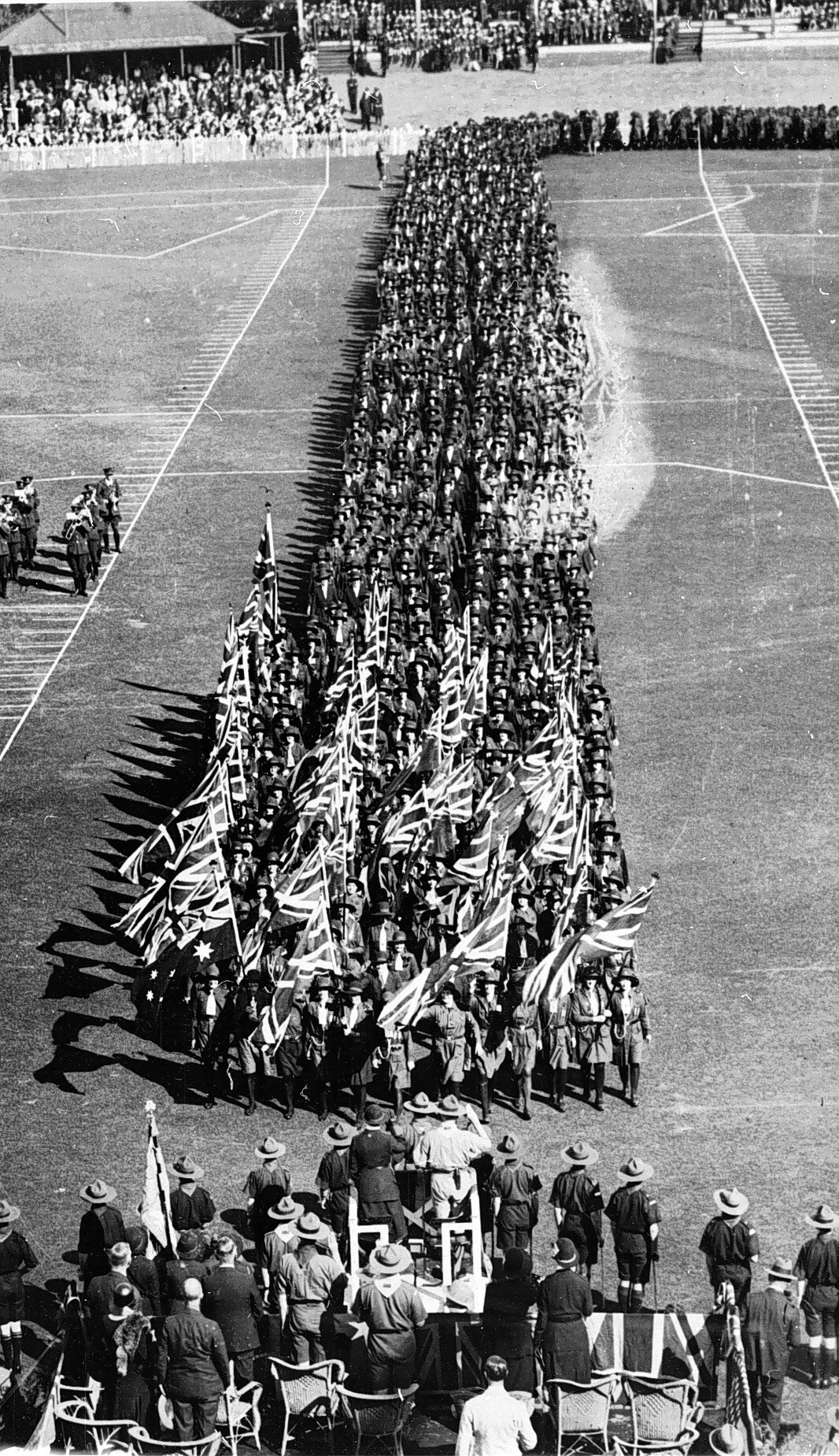A Guide and Scout gathering at the West Geelong Oval. A procession lead by massed Union Jack flags is lined up before an official dais.