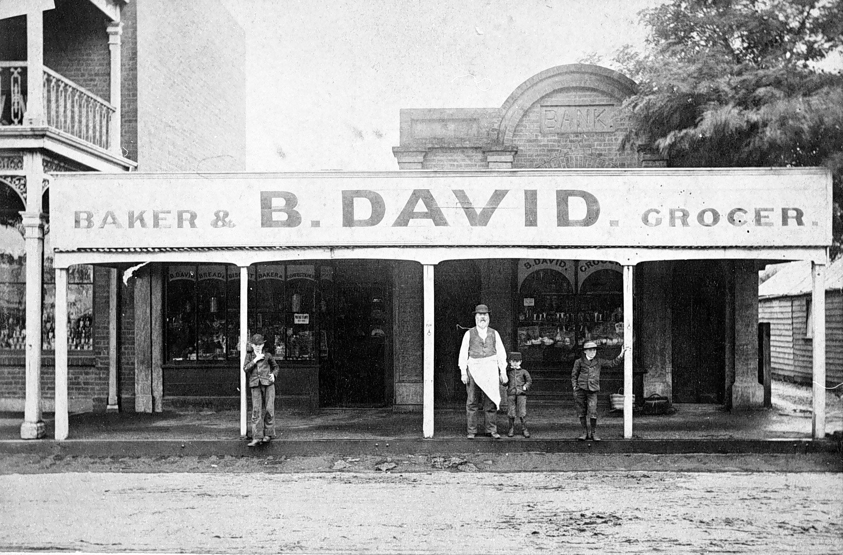 The owner and his sons in front of the shop of B. David, Baker & Grocer.