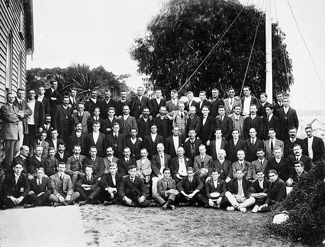 Hawkes Brothers Diamond Jubilee Picnic. The all-male group is gathered behind a building which, from its windows, may be a church.