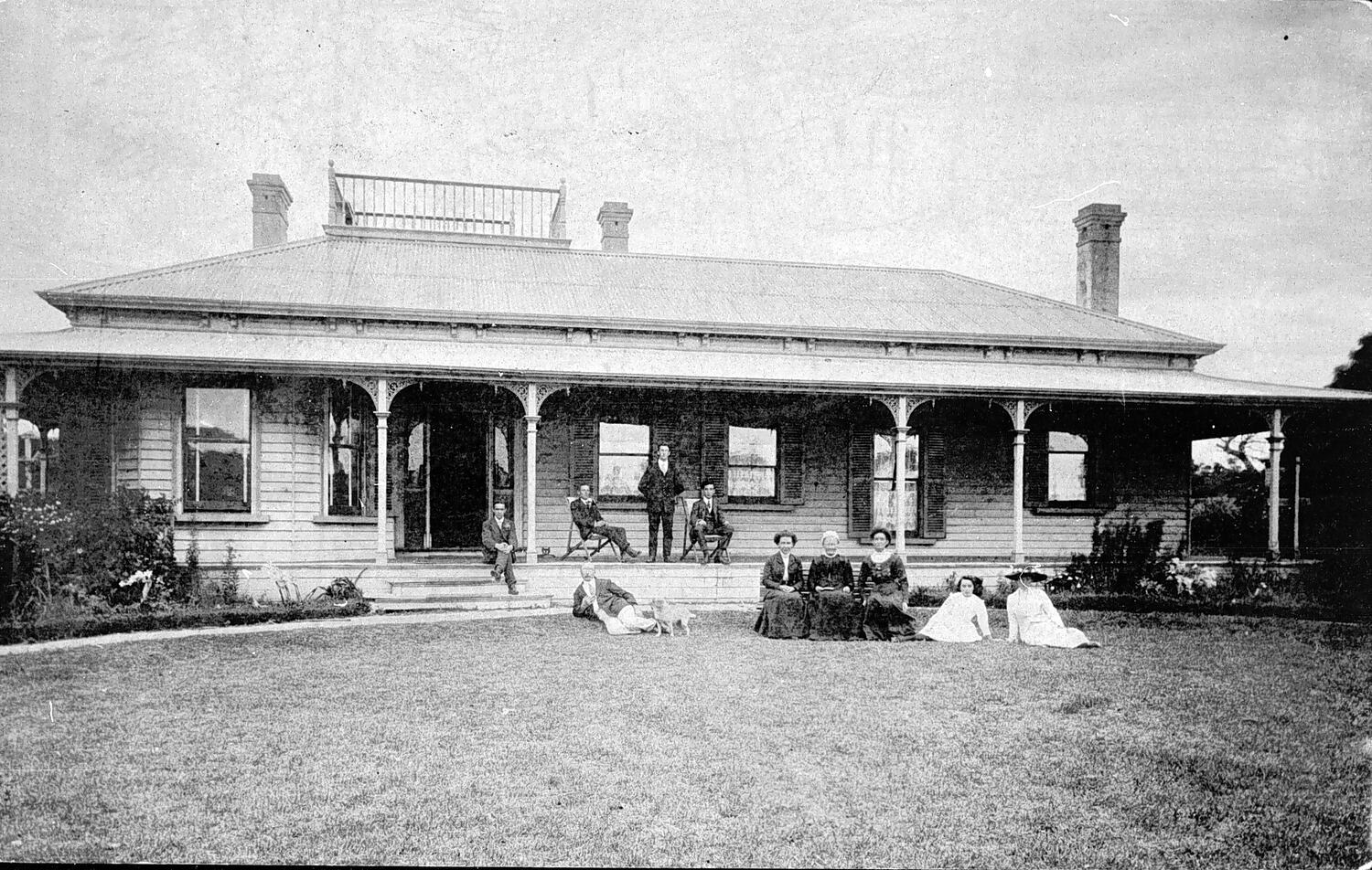 A group of people in front of 'Rockcliffe House' . Three women, dressed in dark clothing, are seated together and may be the owner/staff of the guesthouse.