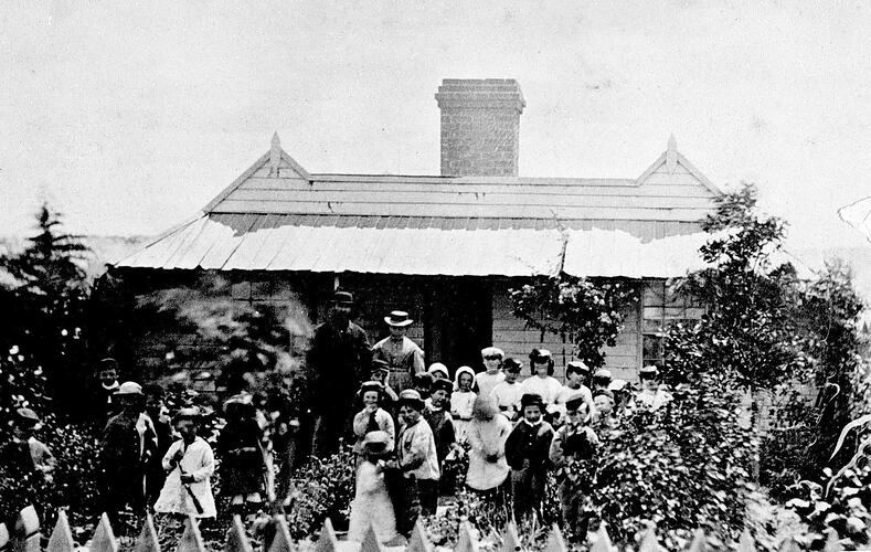 A couple with a large group of children in the garden in front of a house. A children 's party?.