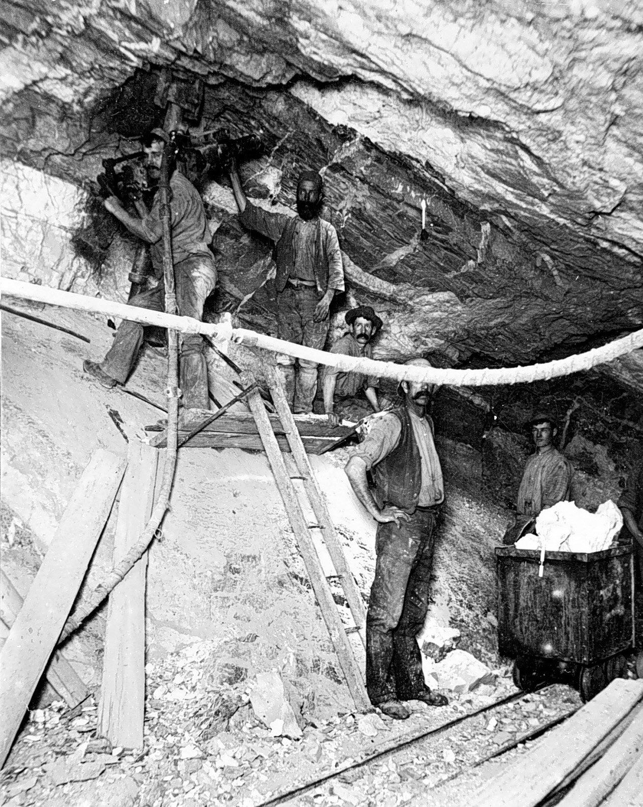 Miners in the eastern leg of the Hustlers No 1 gold mine at 1329 feet beneath the surface. There is a filled trolley on the right.