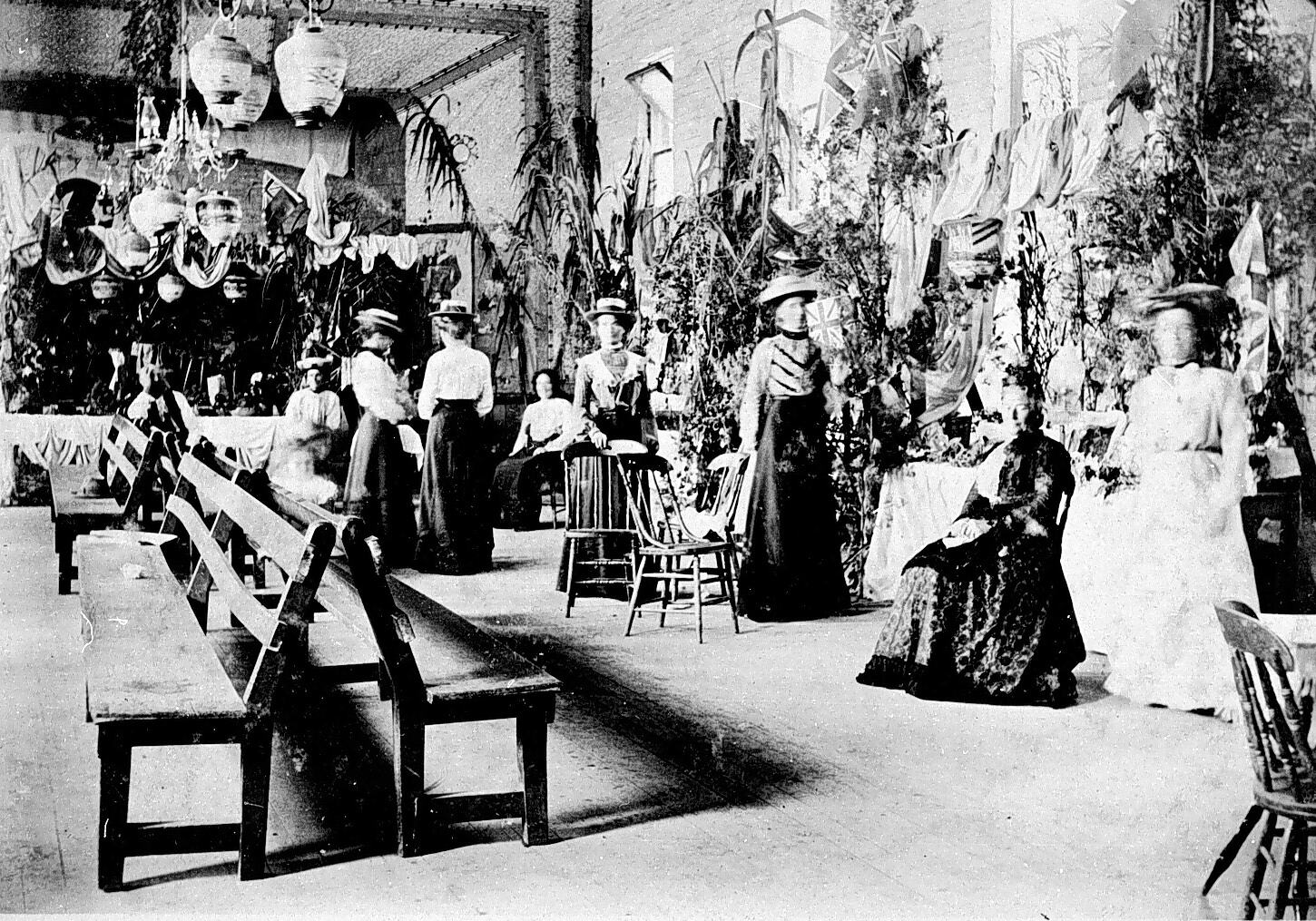 A group of women in a hall which has been decorated for a church function.