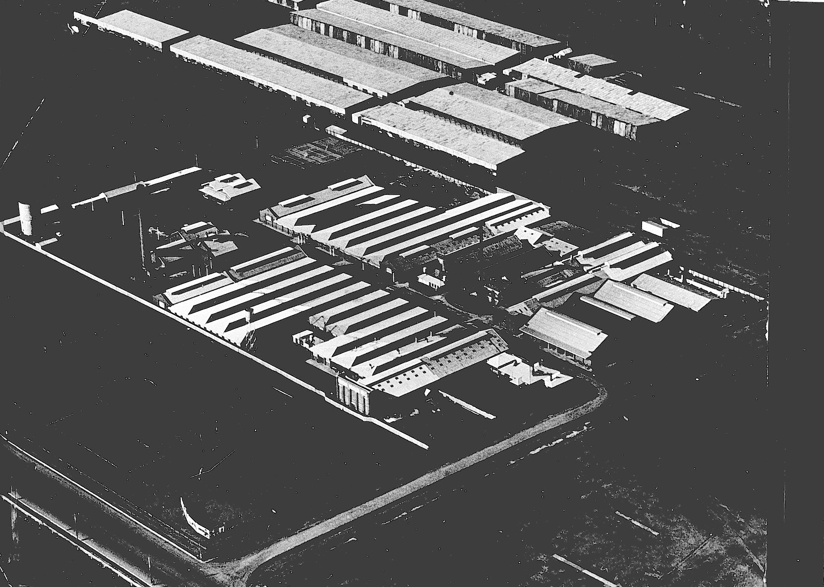 Aerial view of extensive single story galvanised roofed buildings, possibly a factory, probably International Harvester.