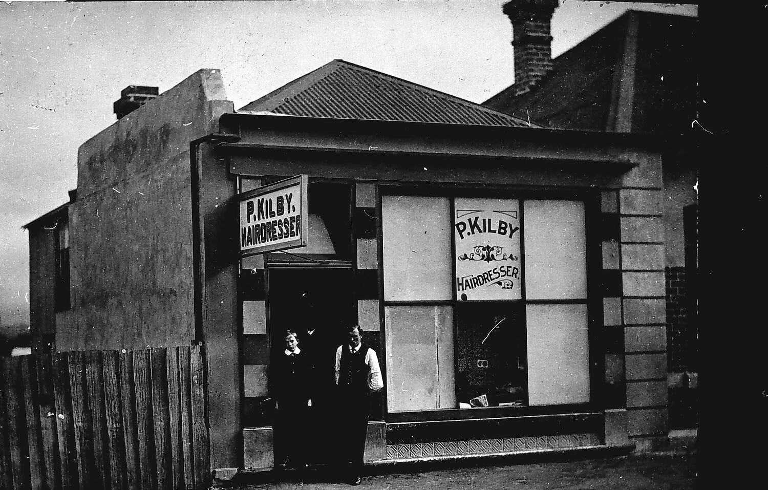 A man and boy in front of the shop of P. Kilby, hairdresser.