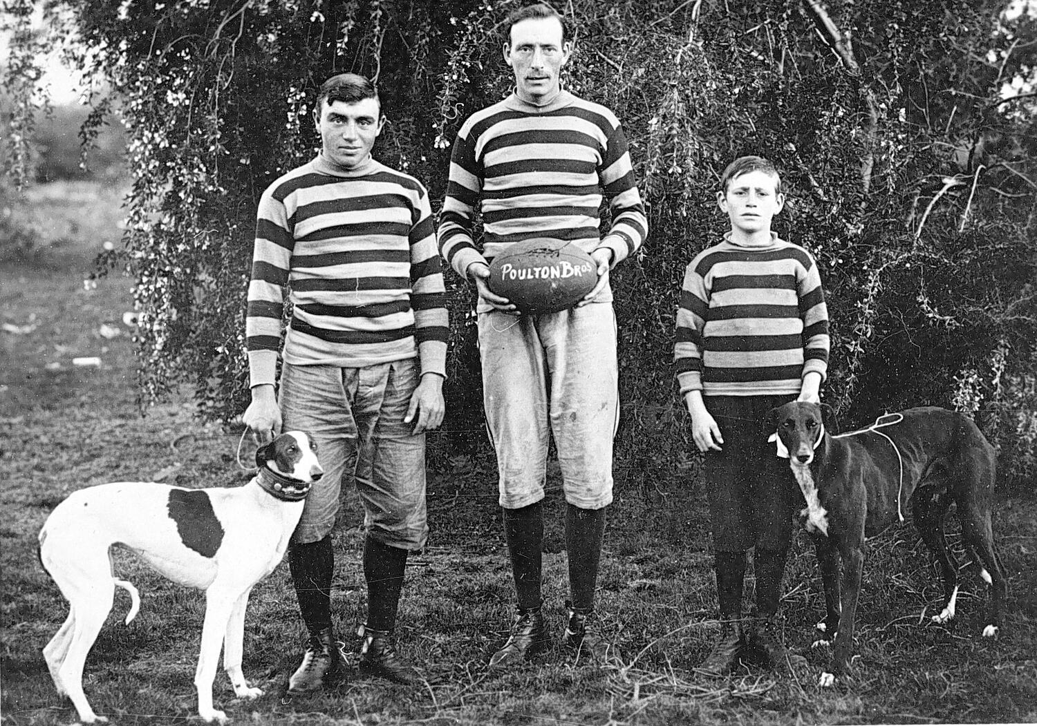 The Poulton brothers and their greyhound dogs. The middle brother holds a football inscribed 'Poulton Bros.'.