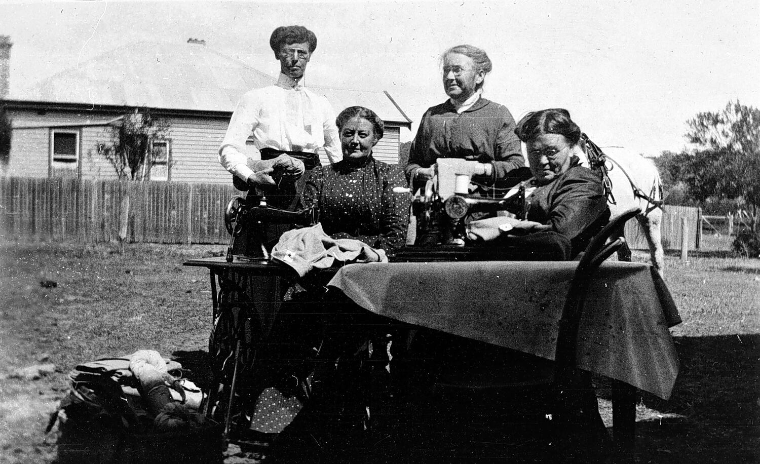 Four women at Red Cross sewing party. The party is taking place out of doors and there is a horse in the background.