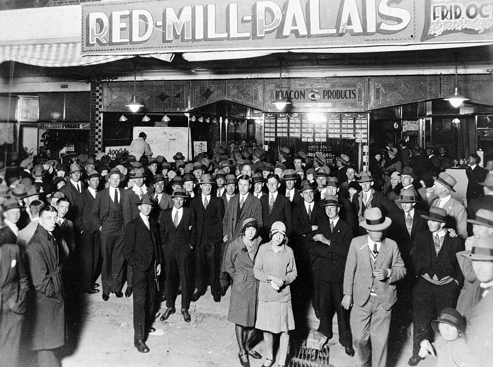 Crowds outside the Red Mill Palais watching the photographer, while in the background a man in a window is drawing a large cartoon.