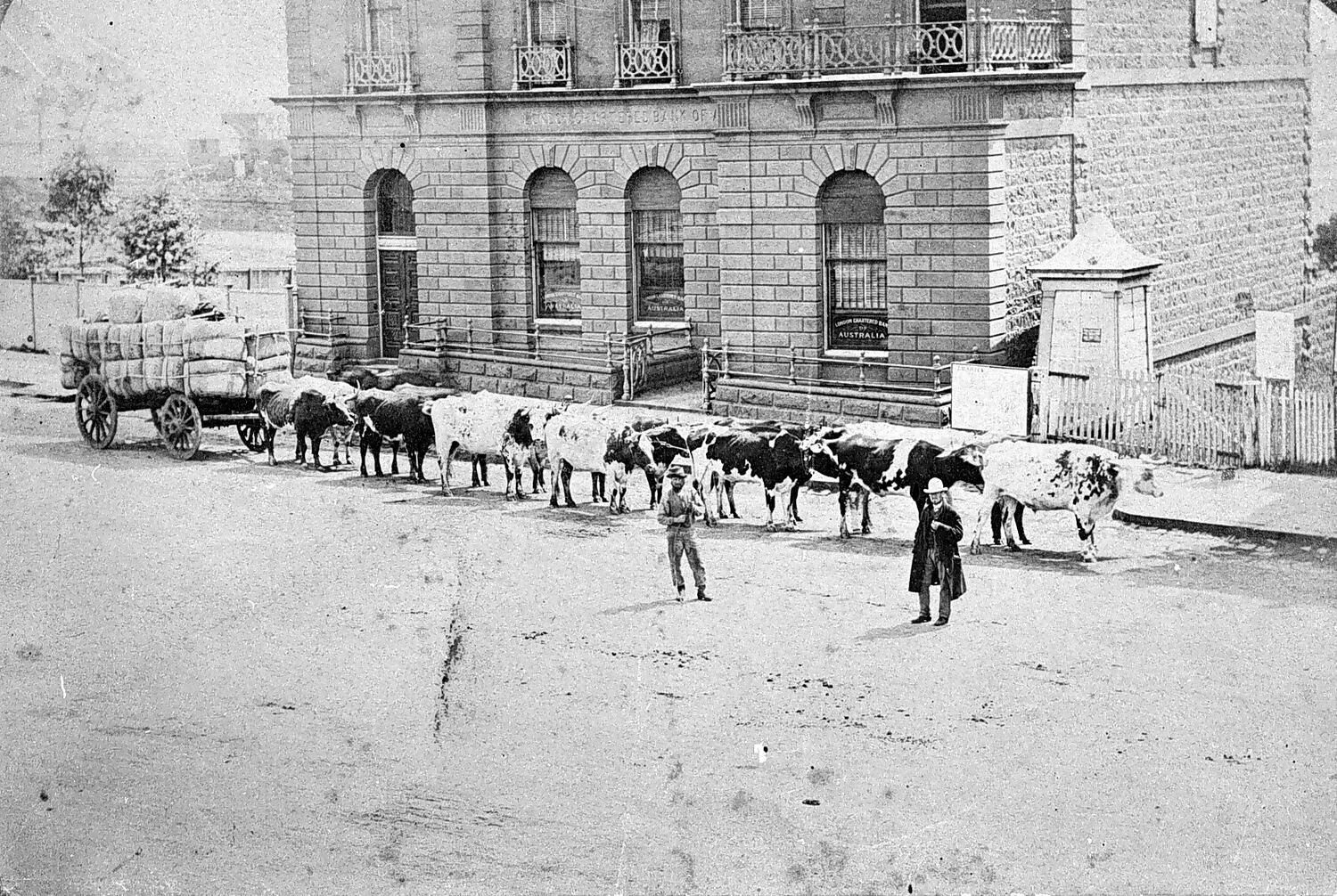 A wagon load of wool drawn by a bullock team. In the background is the London Chartered Bank of Australia.