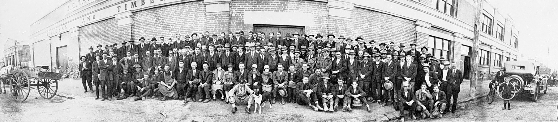 The workers at J. Taylor & Sons Proprietary Limited. There is a horse and cart on the left and a motor car on the right.