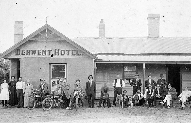 A group of eighteen (18) people standing and seated in front of the Derwent Hotel at Batesford. Three of the group are standing beside or astride early motor bikes, identified as being pre-World War I model Triumph motor cycles of single cylinder belt-driven type, with acetylene headlamps. The men are wearing hunting outfits and have motor cycle googles, and have rifles slung over their shoulders. Two also appear to have rabbit carcasses slung around their necks. Two of the motor cycles have registration plates bearing the numbers '16385' and '17879'. Three of the other men are crouching in hunting dogs. Other people depicted include two well dressed men seated at the far right-hand end, one dressed in a white suit seated on a cane chair and the other with smoking pipe in one hand and large metal tankard in the other is seated on the end of a wooden bench. Other people in the group look like local farm or itenerent workers, possibly a travelling salesman (carrying a sample bag) and probable hotel domestic staff and proprietors at the left-hand end. The forward projecting room at the left-hand end of the building has the words 'DERWENT HOTEL' painted on the gable-end and 'BAR" painted on the front window. The building has several brick chimneys. The Derwent Hotel situated on the Geelong-Ballarat Road (now known as the Midland Highway) was originally built during the 1850s to service gold miners and prospectors travelling between the Port of Geelong and the Ballarat diggings. It was rebuilt in 1910 as a simple single-storey weatherboard structure with corrugated-iron roof and front verandah as shown in this view.