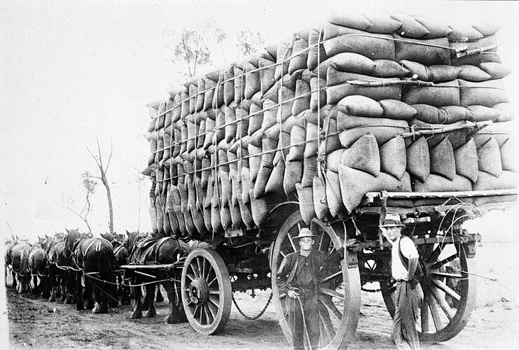 A record wheat load: 407 bags 32 tons nett, 45 tons 17 cwt 2 qrs gross. It required 15 horses to pull it.