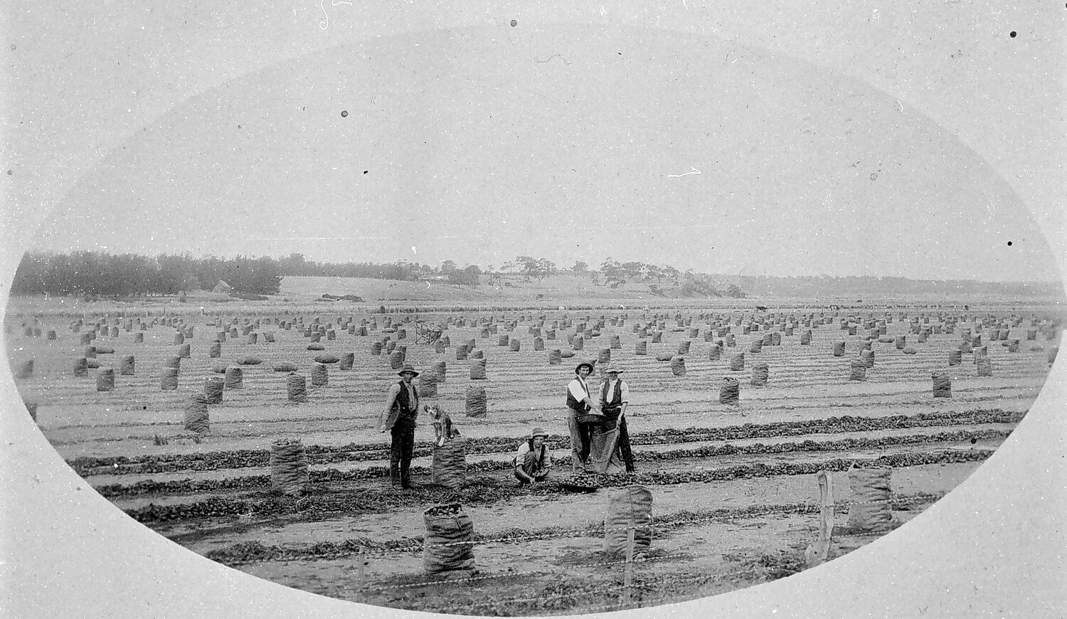 Men picking onions. There are filled sacks spread across the paddock behind them.